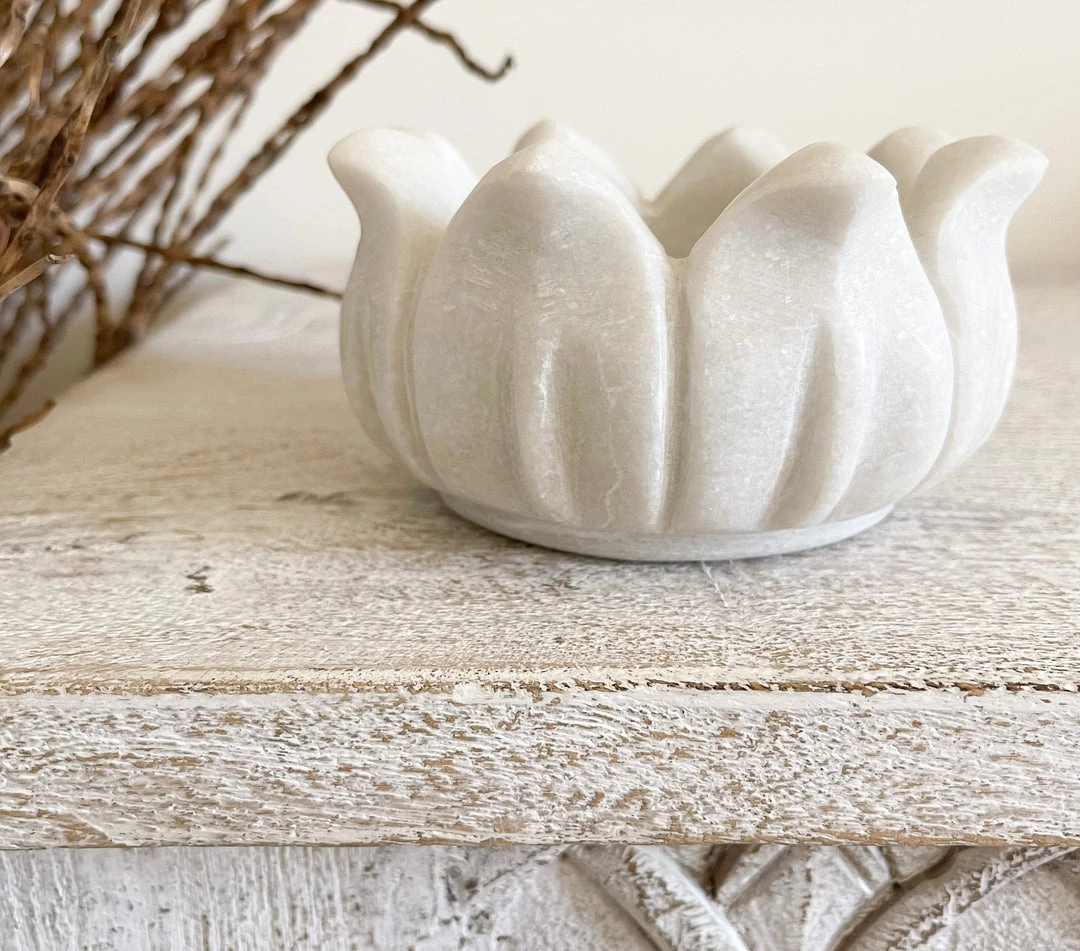 This gorgeous Lotus Marble Trinket bowl is perfect for holding all of your treasures. Carefully carved into a lotus flower design, this trinket bowl will sit perfectly on your bedside table, console table or coffee table. With it’s elegant design, this piece would also compliment any bathroom.Â