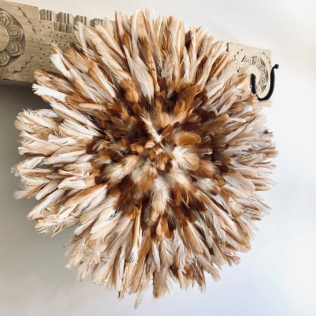 Skilfully handmade by artisans in Cameroon, the Juju hat or Bamileke feather headdress is traditionally worn by royal dancers during significant ceremonies held by tribal chiefs in the Cameroon region of Central Africa. Since then, the Juju hat has evolved as a contemporary piece in wall décor for homes and other interior designs.Â