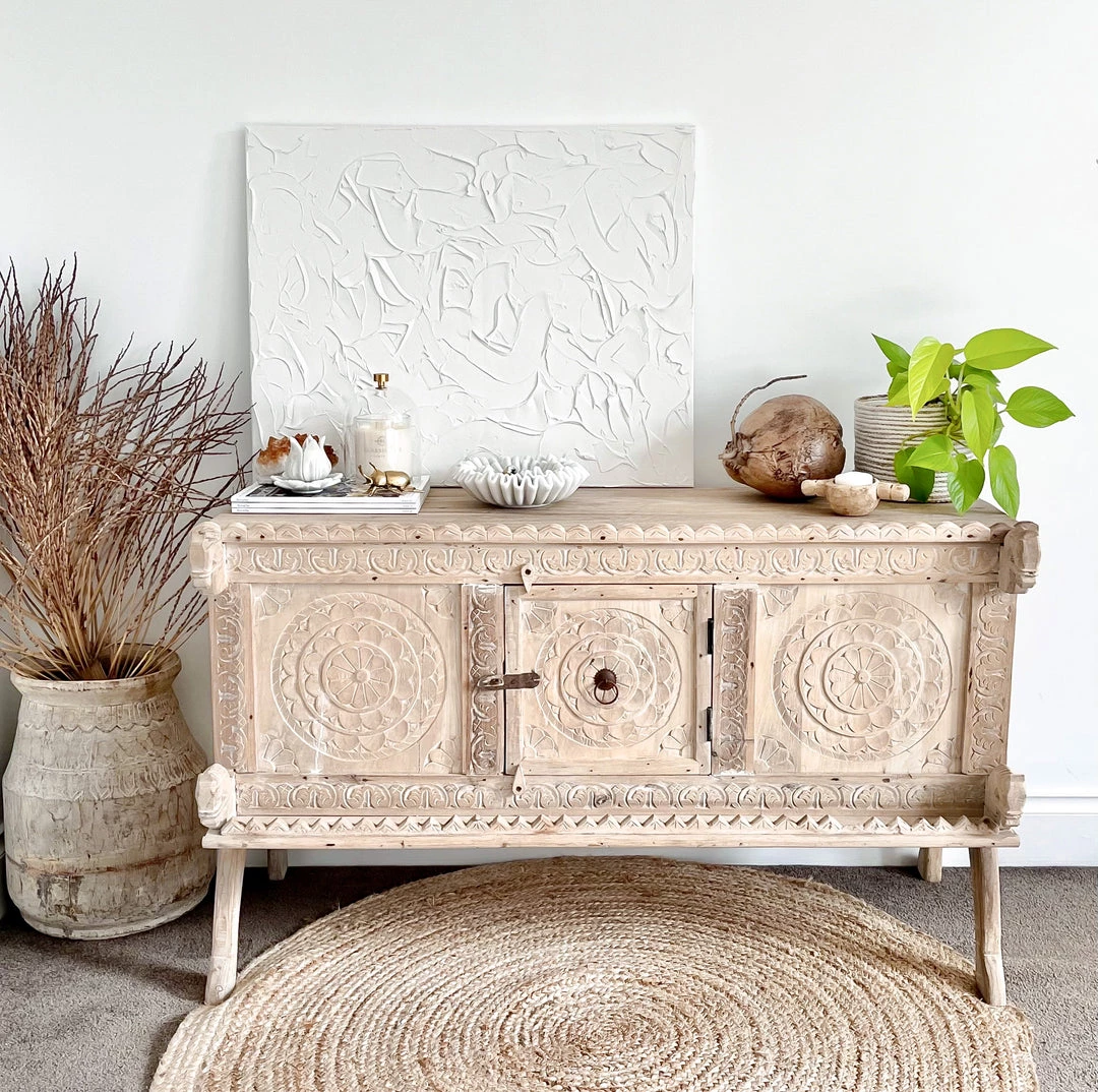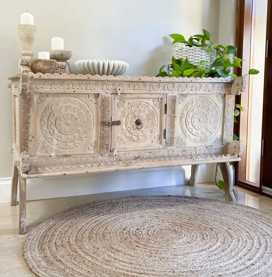 This hand-carved Damchiya console table is unique, it has a rustic earthiness to its patina and is a gorgeous piece that would suit a smaller space. This piece has lots of intricate carvings along the front with a door that opens to provide storage.Â
