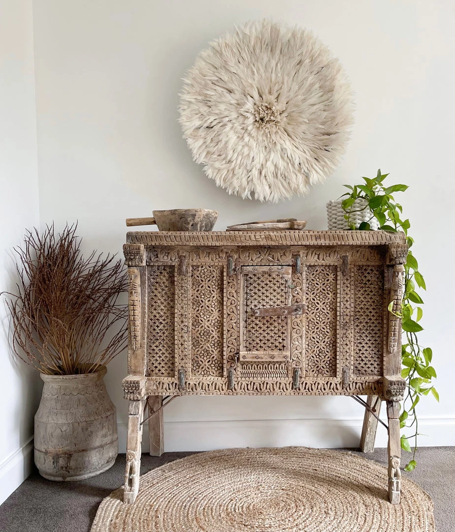 This large Damchiya has lots of intricate carvings along the front with a door that opens to provide storage.Â