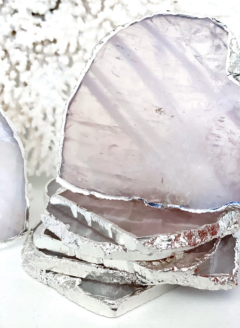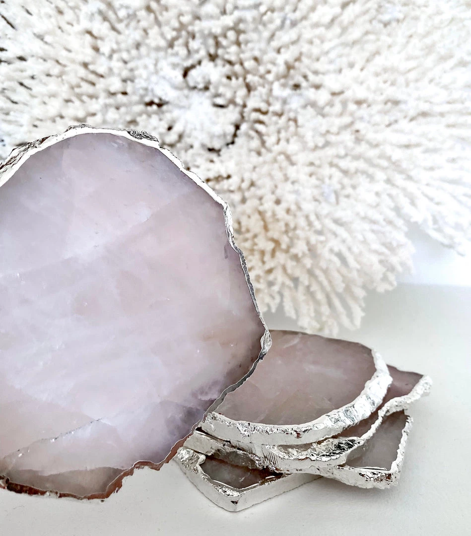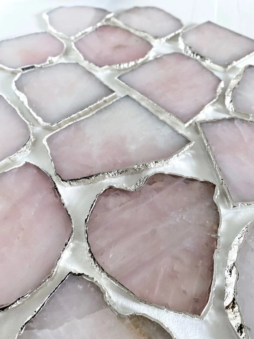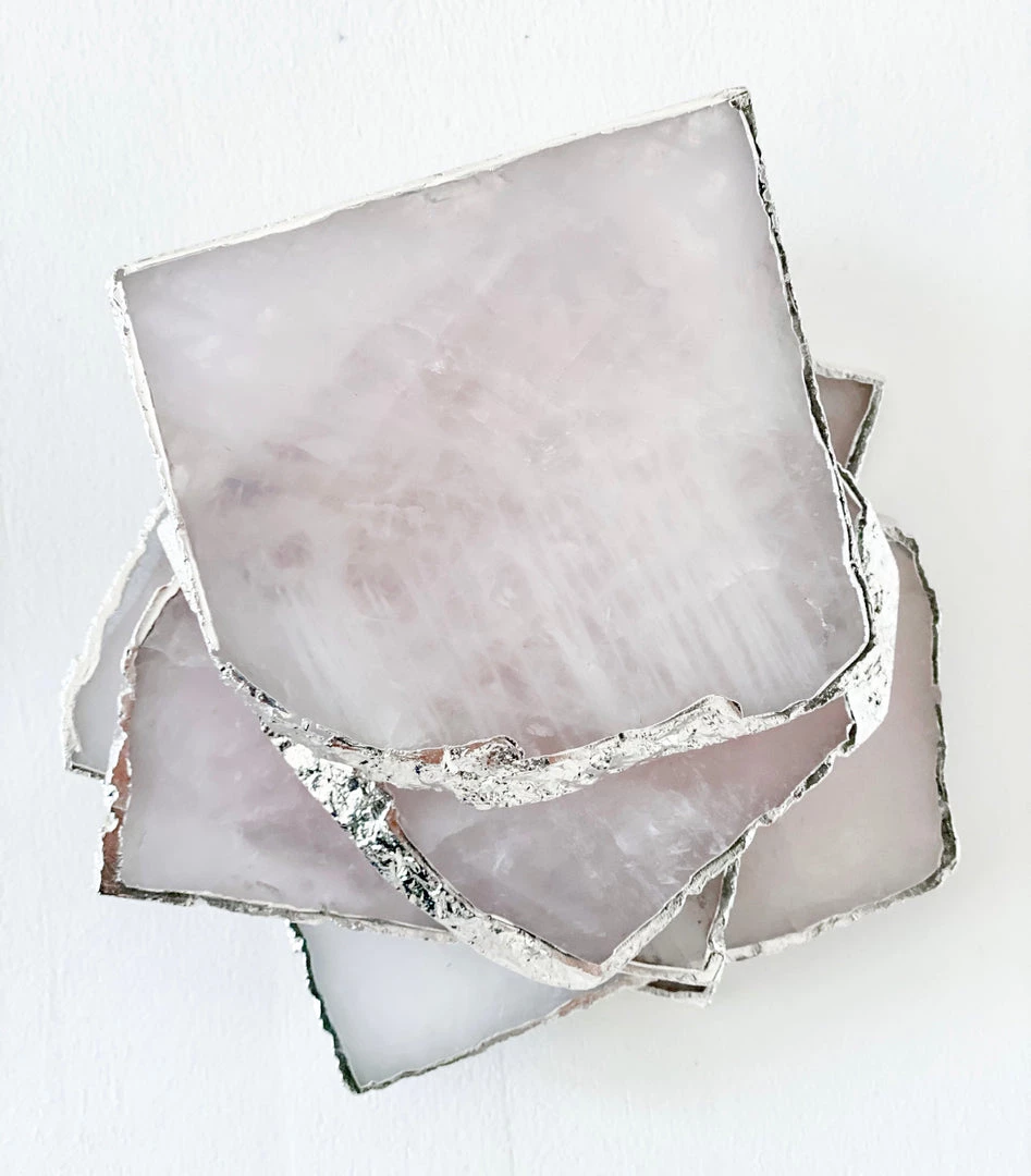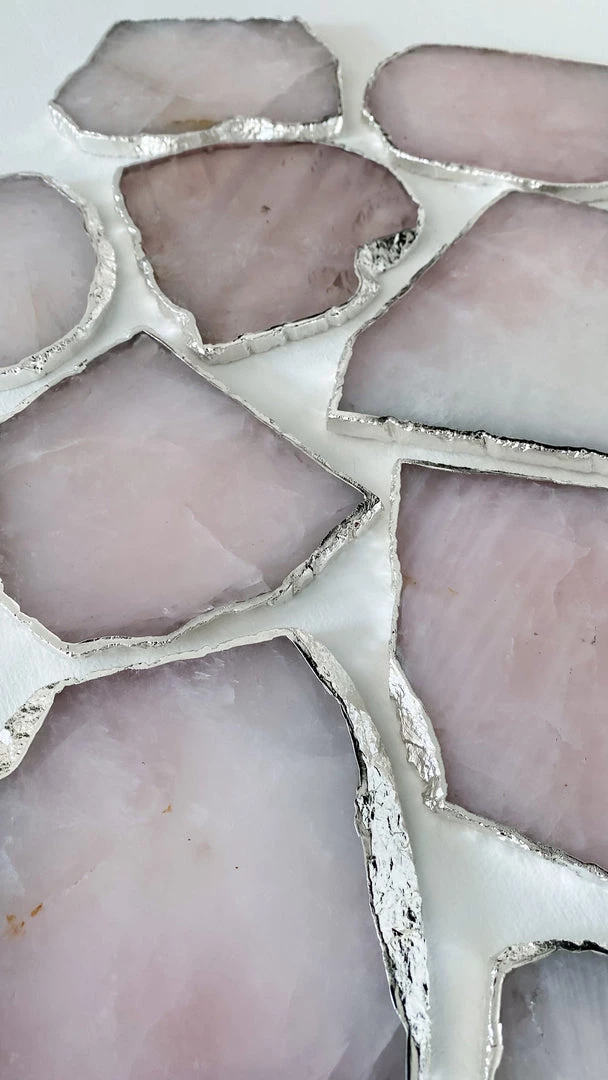 Our Rose Quartz coasters are unique in appearance, with varying colours, markings, size and shape, with a luxe silver metallic edge. They’re the perfect piece to take entertaining to the next level.