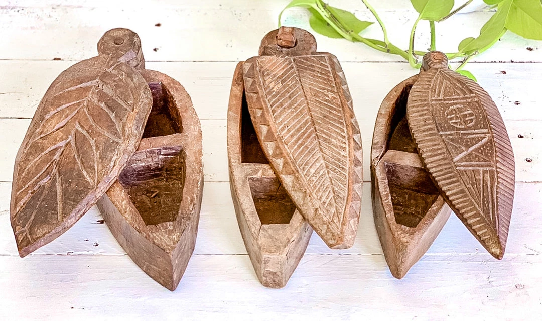 These unique Indian carved Tikka boxes are perfect for storing trinkets and treasures.Â
