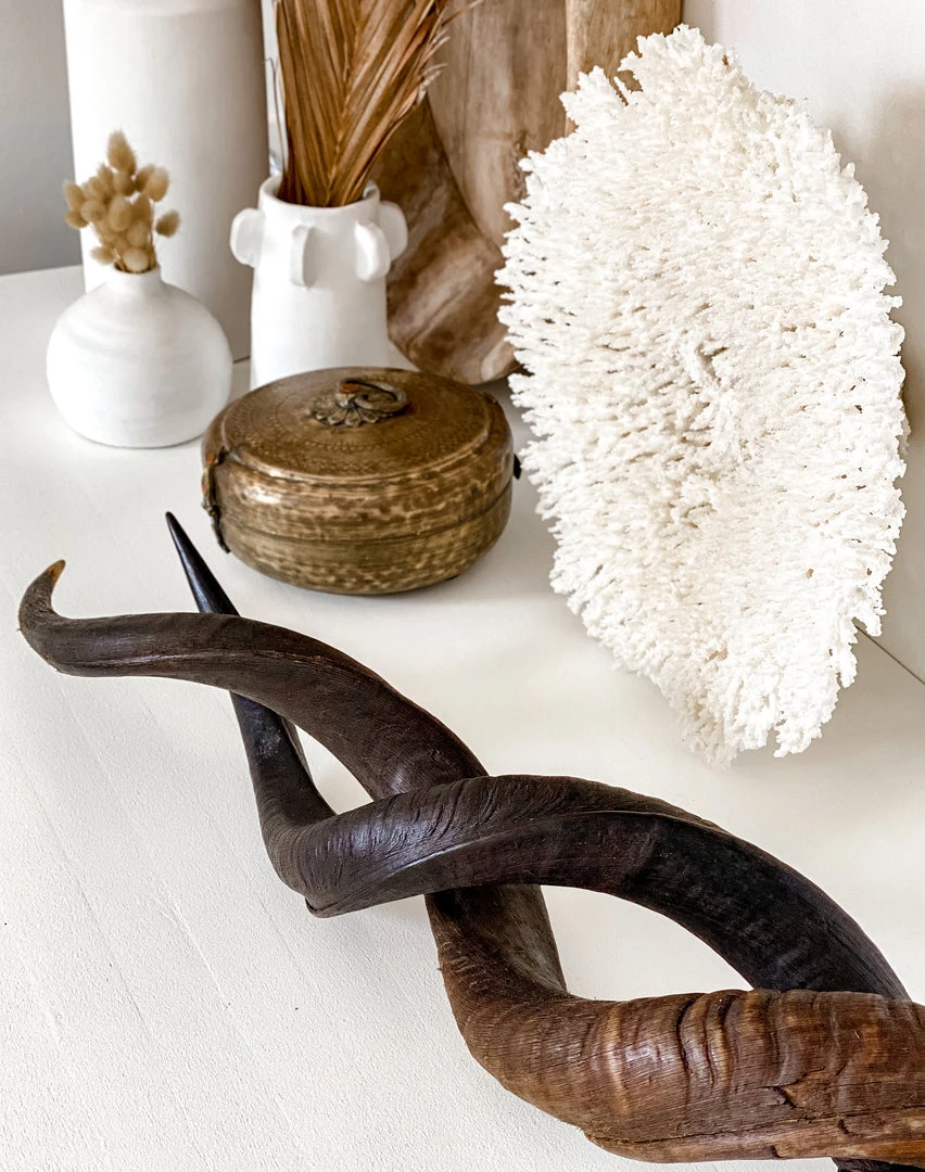 Kudu Horn outer – unpolished. These horns have been sustainably sourced. These horns make for an unusual and a sculptural eye-catching piece. These unpolished horns adds a contemporary African aesthetic to any decorative style. Twist them in a pair on a table or console for maximum affect.Â