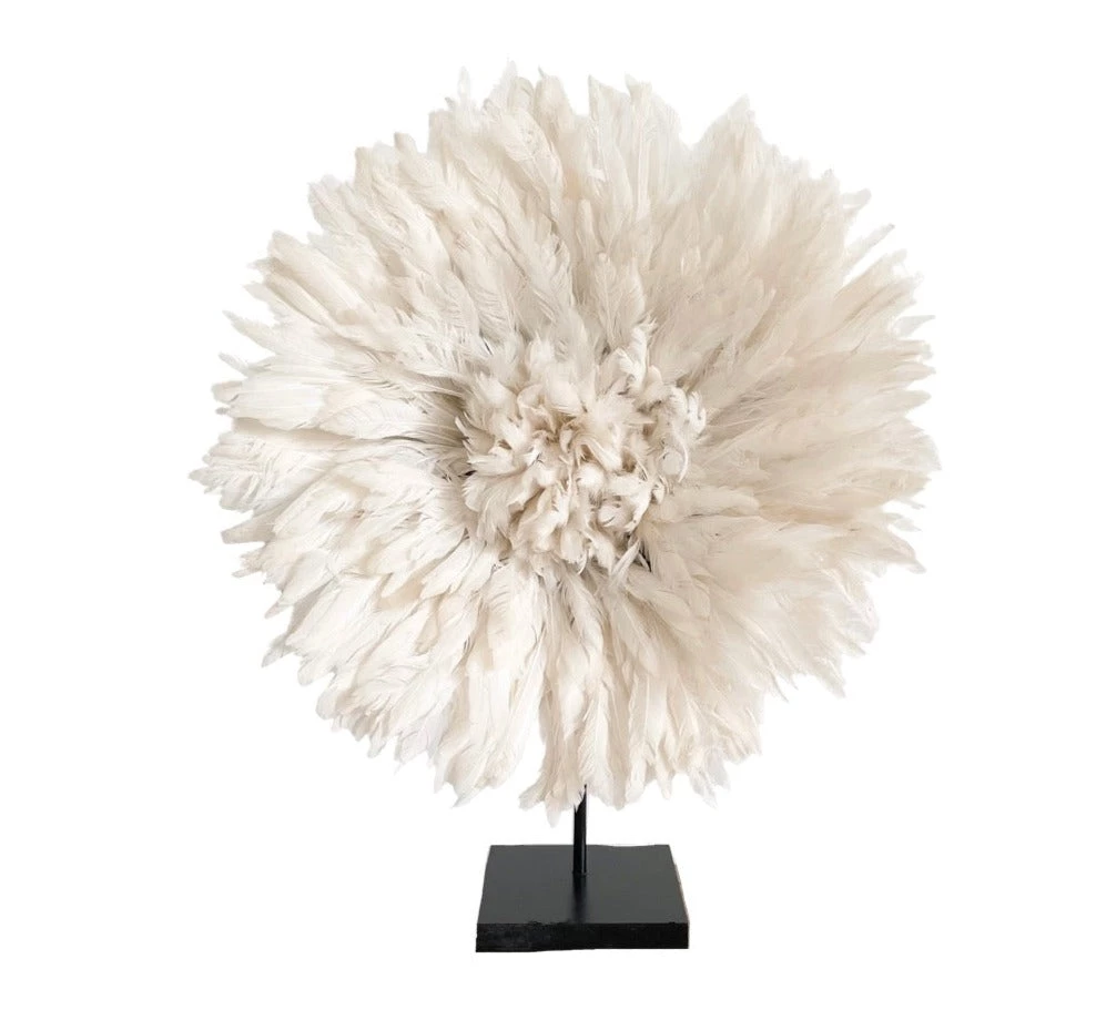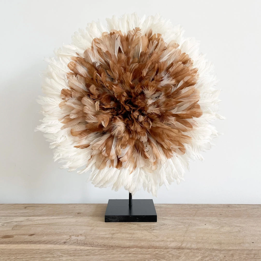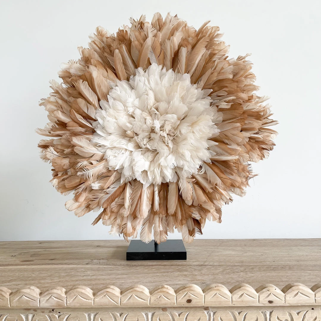 Skilfully handmade by artisans in Cameroon, the Juju hat or Bamileke feather headdress is traditionally worn by royal dancers during significant ceremonies held by tribal chiefs in the Cameroon region of Central Africa. Since then, the Juju hat has evolved as a contemporary piece in wall décor for homes and other interior designs.