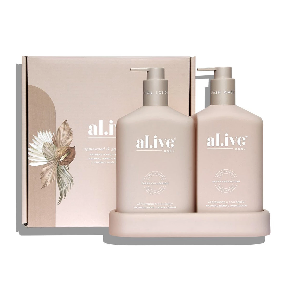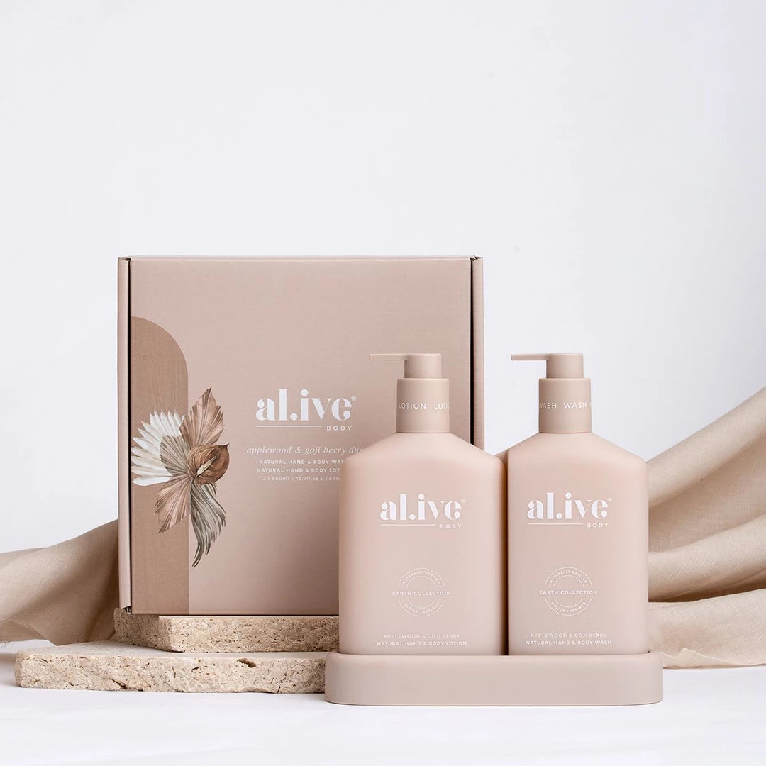 The al.ive body® Applewood & Goji Berry Hand & Body Wash/Lotion Duo contains a luxurious blend of naturally derived ingredients, fortified with essential oils and native botanical extracts.