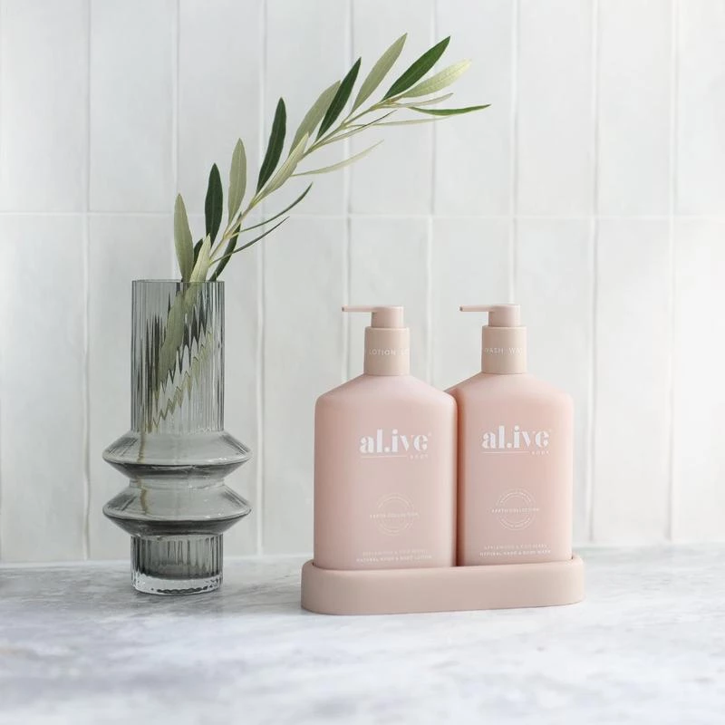 The Duo includes a 500ml hand & body wash, 500ml hand & body lotion and a matching tray.