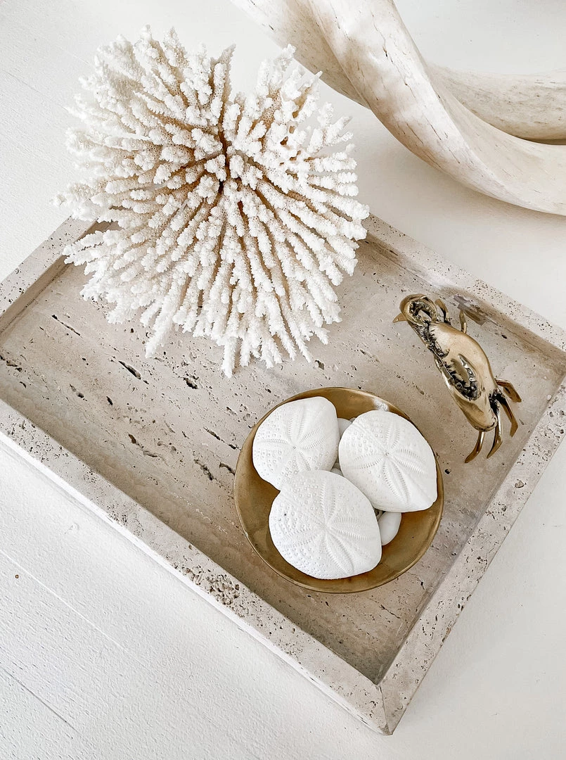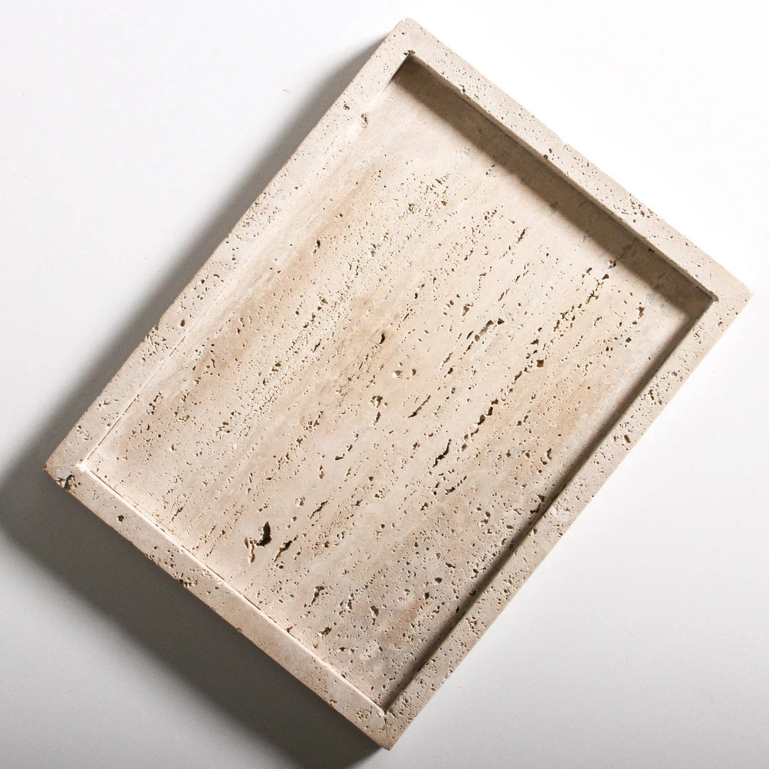 Crafted from natural travertine, our Travertine tray celebrates chic and minimal design. This beautiful tray can be used for myriad uses, but we think it makes the perfect catch all on your bedroom dresser for jewellery and bottles of perfume, or as a display stand in your bathroom for soaps and scented candles. No two trays are the same, as each will display different tones and patterns in the stone’s surface.