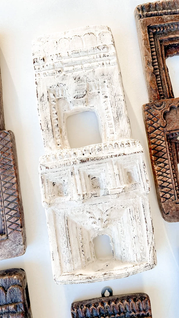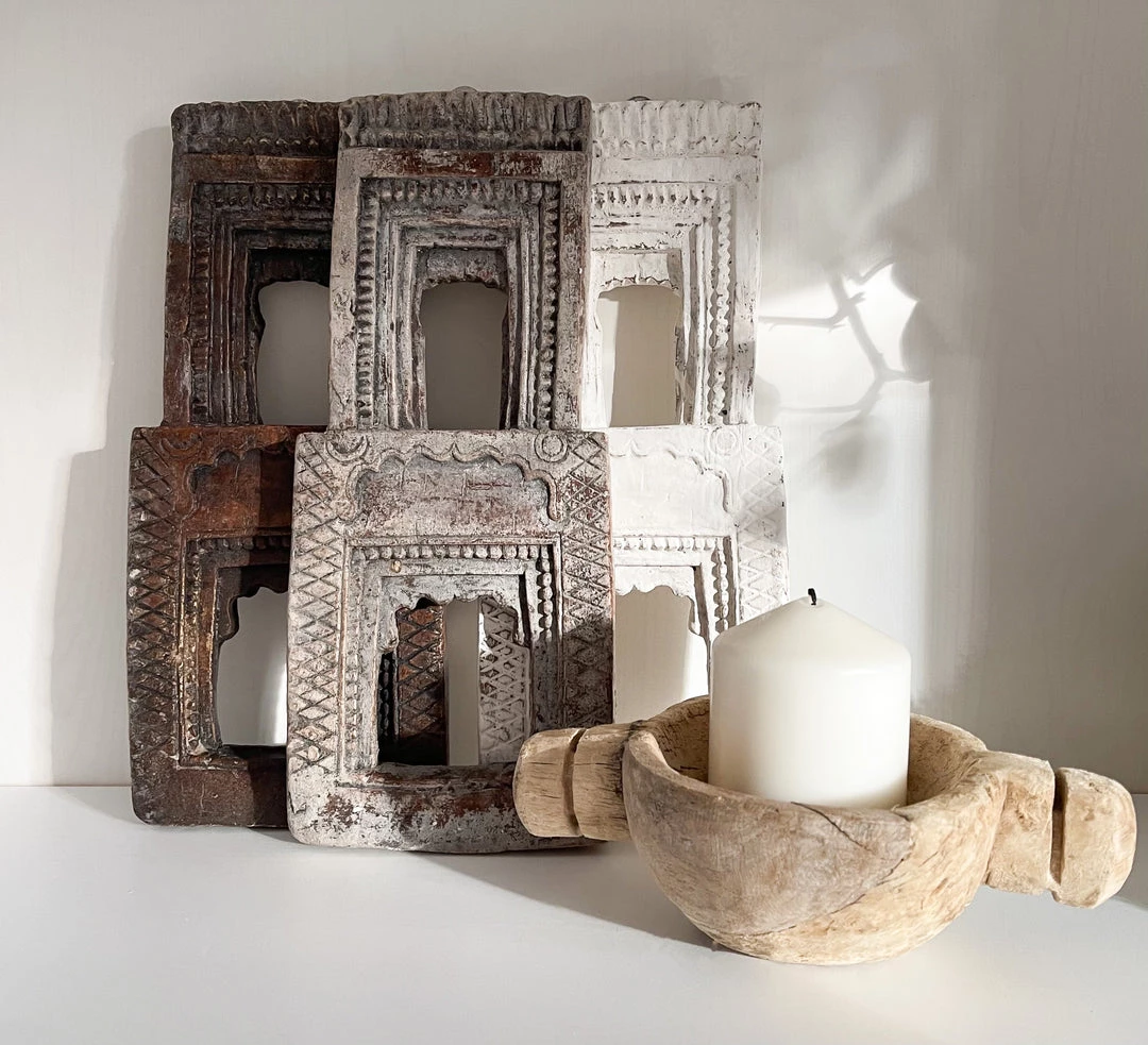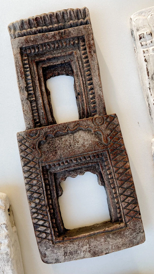 Each temple frame is hand crafted from antique clay with its own unique raw earthy texture. Each frame comes with rings attached for easy wall hanging. Simply group together on a wall or combine on a console table for display purposes. Â