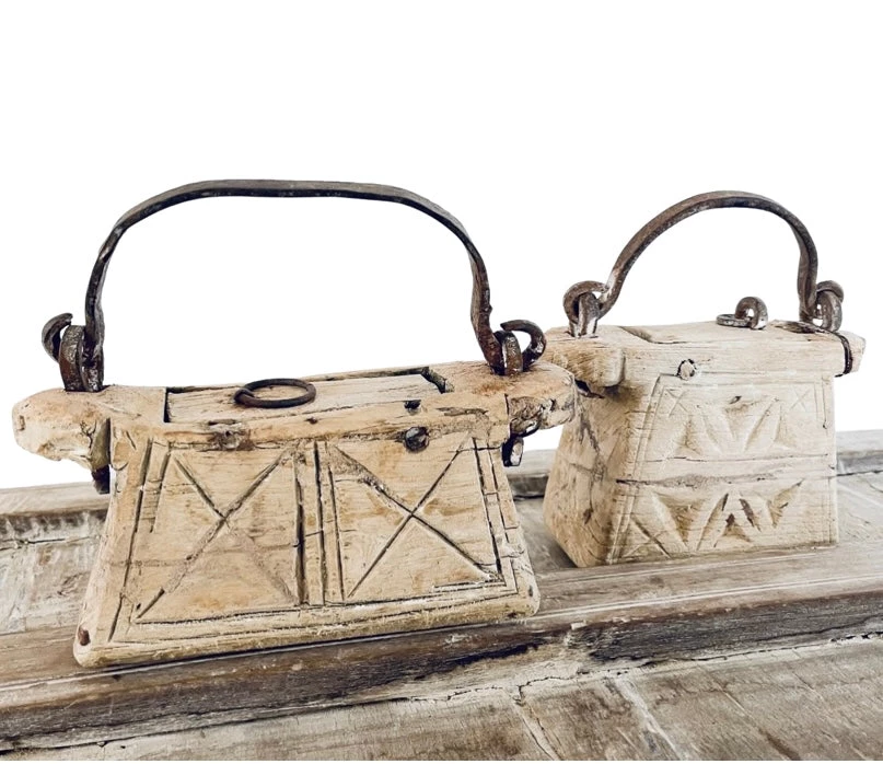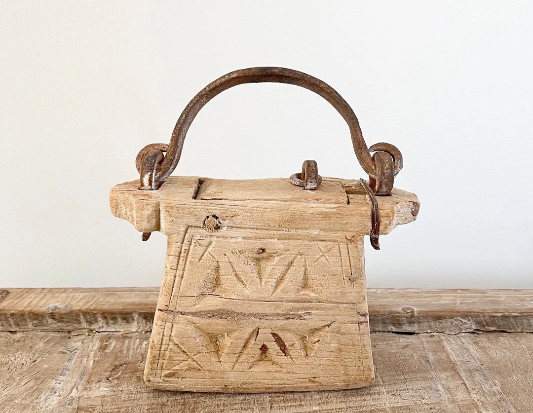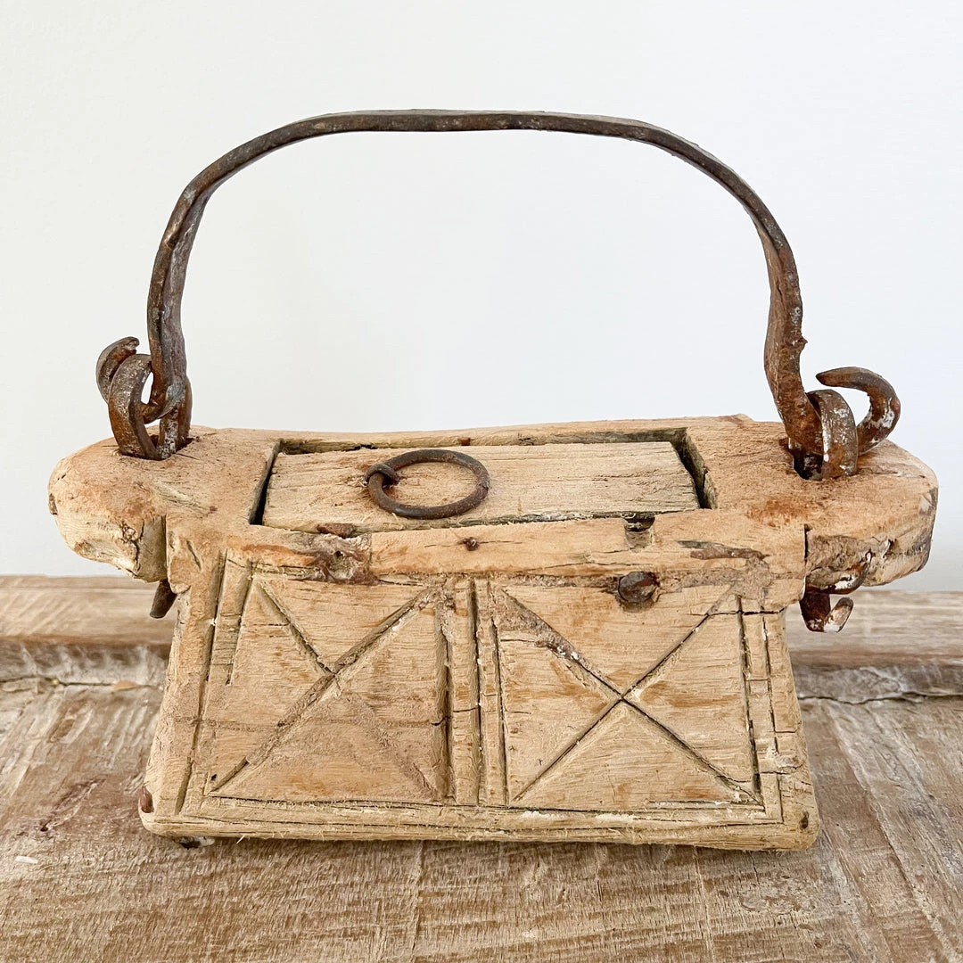 A collectors piece perfect as a small storage container or as an accent decor item. Handmade teak wood container to store ‘ghee’. A vintage piece circa 1960. This piece features the original hand made iron handle and lid.Â